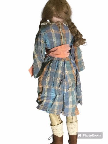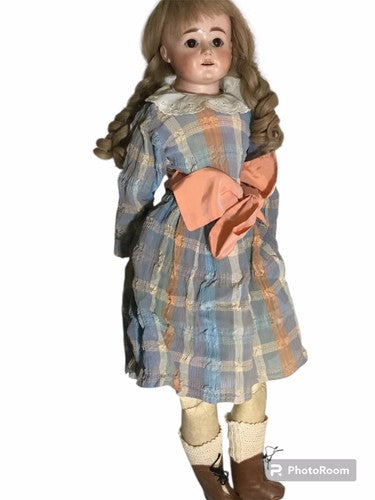 Ich biete hier eine antike Porzellankopf-Puppe aus deutscher Produktion an. Die Puppe hat einen fein modellierten Bisque-/Porzellankopf, Glasaugen mit Schlafmechanik sowie eine ältere Haarperücke. Der Körper besteht aus einem klassischen Ledertorso mit Kompositionsarmen und -beinen – eine typische Fertigung um 1880–1915.